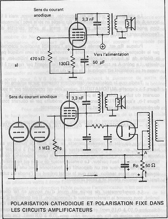 sont illustrés deux circuits amplificateurs typiques. Ils se différencient entre eux par leur système de polarisation. Toutefois, ils permettent tous deux de fournir à la grille contrôle le potentiel négatif continu nécessaire pour le fonctionnement correct du tube amplificateur.
