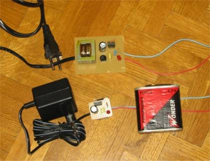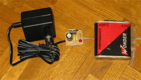 Voici le montage que je préfère car on peut insérer le petit circuit dans la radio (voir la taille par rapport à une pile de 4,5v). Le 220v est totalement absent donc pas de rayonnement dû au transfo.