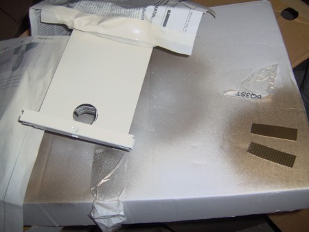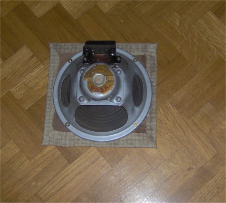 Remontage de la toile et du Haut-Parleur. Le carton n’était pas HS, il était juste percé à trois endroits. Avec de la colle type Néoprène, je l'ai récollé pour éviter toute vibration, (Cela m'a rappelé mes 16-17 ans, pas beaucoup d’argent donc je récollais les cartons des HP que je récupérais à droite et à gauche pour mes différents montages)