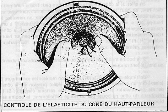 Un contrôle effectué de la façon représentée, c’est-à-dire en exerçant avec les doigts une légère pression sur le cône, si la membrane du cône ne bouge pas ou bouge difficilement, la bobine est bloquée ou bien elle frotte contre l’aimant.