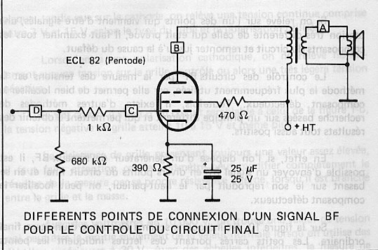 Ensuite on applique le signal entre la grille de commande et la masse (point C). Si le circuit est bon, on entend dans le haut parleur un sifflement bien plus fort que les précédents, Des déformations du signal de sortie indiquent des défauts de polarisation ou un épuisement du tube final.