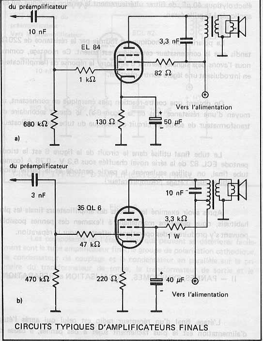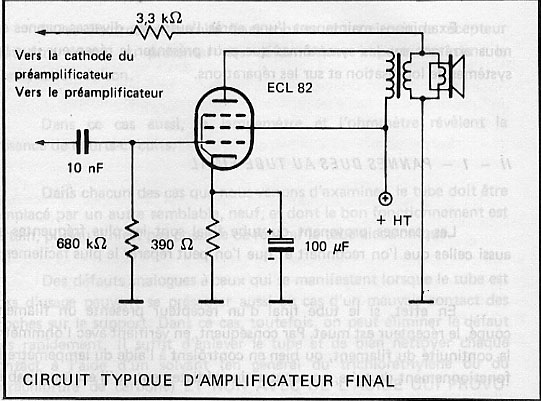 Les composants de l’étage final qui peuvent se détériorer facilement sont le tube amplificateur final, le groupe de polarisation cathodique, le condensateur de couplage et le condensateur en parallèle sur le primaire du transformateur de sortie, le transformateur de sortie et le haut parleur.