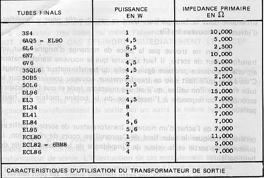 Les caractéristiques essentielles d’un transformateur de sortie sont l’impédance de charge et le rapport de transformation. L’impédance de charge est représentée, approximativement par la résistance de la bobine mobile du haut parleur (de 3 à 6 ohms). Dans un but de simplification, l’indication du rapport de transformation est souvent remplacée par l’indication du type de pentode ou de tétrode à utiliser.