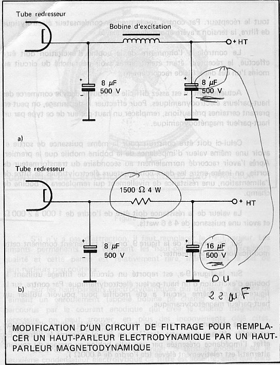 Sur (la figure a) est reporté un circuit de filtrage utilisant la bobine d’excitation d’un haut parleur électrodynamique. Sur (la figure b) le même circuit modifié pour pouvoir utiliser un haut parleur magnétodynamique.