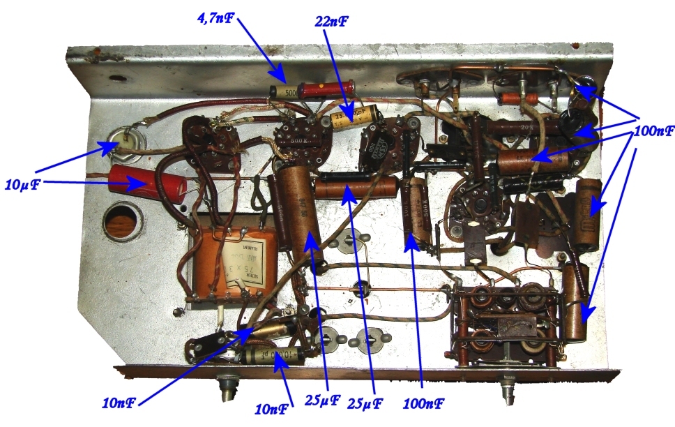 Le changement des condensateurs ne pose pas de problème en particulier, bien respecté la polarité des deux condensateurs de filtrage d’alimentation (attention il y a 350volts) et également les condensateurs des cathodes de 25µf en parallèle de la résistance de 250 de polarisation du tube 6V6 et le deuxième en parallèle de la résistance de 5k du tube 6Q7. L’ensemble résistances et condensateur sont des résistances de fuites