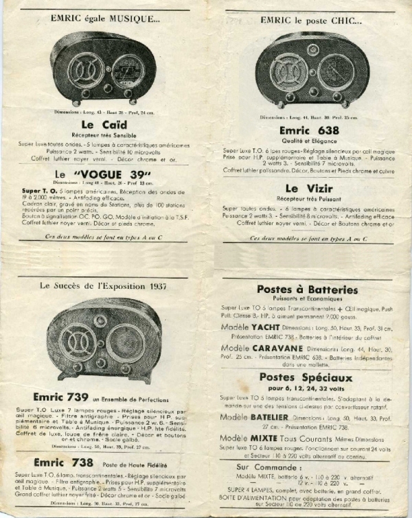 On dirait bien une radio monté artisanalement. Il est vrai que cette marque n’a pas fait beaucoup de modèle. La marque EMRIC a vécue 2 ans, 1937 et 1938, Comme beaucoup, après la seconde guerre elle n’a plus donné signe de vie. Cette marque nous a laissé quelques modèles de forme surprenante, mais qui a vraiment son charme, et qui sort de l’ordinaire de nos caisses rectangulaires.