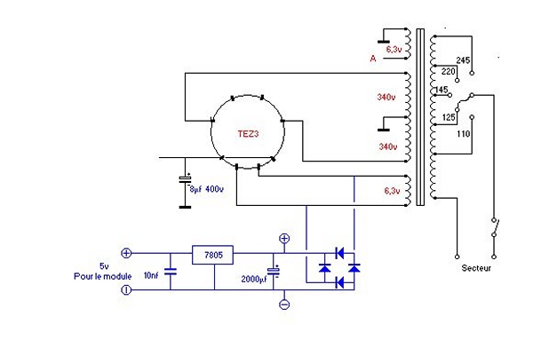 On remarquera que l’alimentation de chauffe dû à la valve, est de 6,3 v contrairement au 5 ou 4 volts que nous avons l’habitude. Mais le tube TEZ3, a une résistance de chauffe de 6,3v.