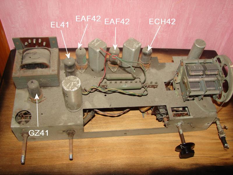 Le châssis est très sale, et bien sur grignoté pas de la rouille perforante, surtout les supports des tubes type Noval. Un traitement efficace est indispensable, car vu l’état de la boiserie, cette radio a séjournée dans une grange ou un grenier depuis de nombreuses années.