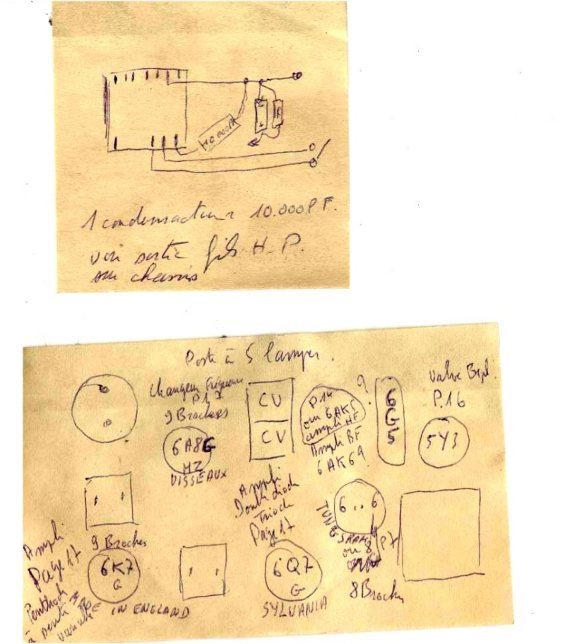 Avec la valve 5Y3gb, 6F6g et le tube 6Q7g. Au bout de 15 – 20 secondes, une très légère ronflette se fait entendre dans le HP. En touchant avec son doigt, la partie supérieure du tube 6Q7g, la ronflette doit être beaucoup plus forte. Si ce n’est pas le cas il faut vérifier toute la partie puissance et HP. Si c’est le cas on fait un essai avec tous les tubes.