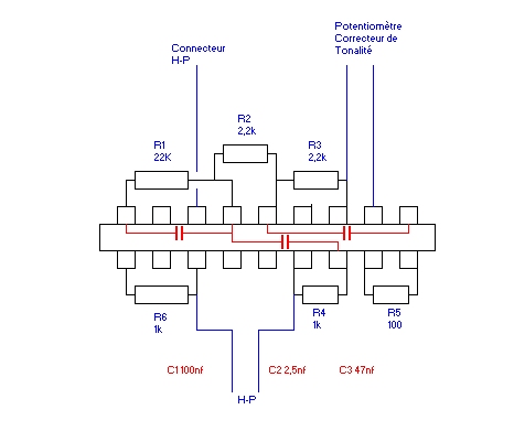 Comme sur les autres Surcouf, il y a un support avec quelques résistances et condensateurs. Même qu’elle soit différente des autres, le correcteur de tonalité est identique donc voici le schéma.