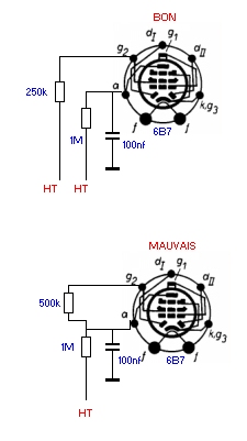 Sur le tube 6B7 la résistance de 250k a été remplacé par une de 500k et celle de 1M a été remplacé par la bonne valeur mais sans que je comprenne la raison. En plus comme le montre, le petit schéma, la résistance de 250k était mal positionnée.