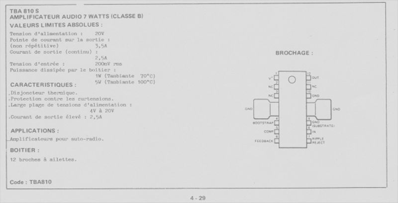 Passons aux choses sérieuses. Dans les années 1975, nous étions au début des circuits intégrés. Ici sur cette radio, l’ampli est composé de 2 circuits TBA810, ce qui évite une multitude de composant comme on pouvait avoir avec les transistors. Sa puissance est de 7wath sous 12 à 14volt. Il y a 1 TBA810s par voie, donc, la réparation va être simple, il suffit juste de changer se circuit.