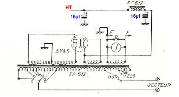 Comme on peut remarquer sur ce document. Il y a un disjoncteur thermique qui coupe la radio en cas de surchauffe. La bobine est prise sur le point central de la HT, la masse, et la coupure se font au niveau du secteur.