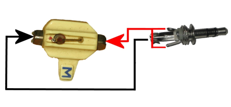 -lors d’une restauration, le bras et la cellule sont très fragiles pendant les diverses manipulations, il est préférable de ne pas utiliser une cellule, (un choc peut être désastreux), mais plutôt ce cordon pour tous les essais, et d’incérer la cellule neuve en dernier une fois que notre Teppaz est fini.