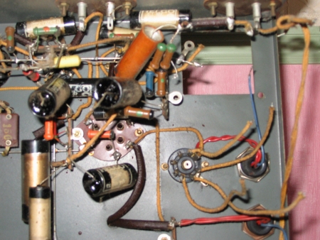 | Changement des condos chimiques de la partie préampli et ampli, sans oublier le condo de liaison, celui du potentiomètre et tous ceux qui ont un rapport avec les tubes EAF42 et EL41 |
