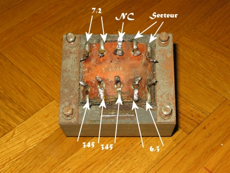 Dans plusieurs rubriques de ce site j’ai rappelé qu’il est très difficile de trouver un transfo de remplacement. Très souvent le transfo est spécifique à une radio et non à une autre. L’emplacement découpé du châssis ne me donne pas le choix, l’entraxe des vis non plus. J’ai trouvé dans mon stock un transfo qui a comme sortie : 6,3v, 7,2v et 2x235v. |